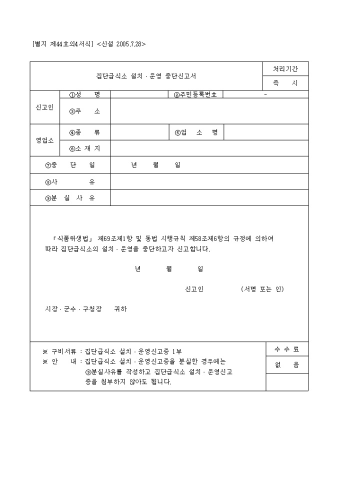 9,000원/월「식품위생법」 제69조제1항 및 동법 시행규칙 제58조제6항의 규정에 의하여 따라 집단급식소의 설치•운영을 중단하고자 신고할때 사용하는 서식입니다