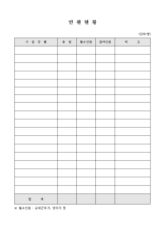 9,000원/월사업장별, 총원, 필수인원, 참여인원, 비고 란으로 구성되어 있는 현장, 생산, 유통, 기타 업체에서 사용할 수 있는 인원현황표입니다.
