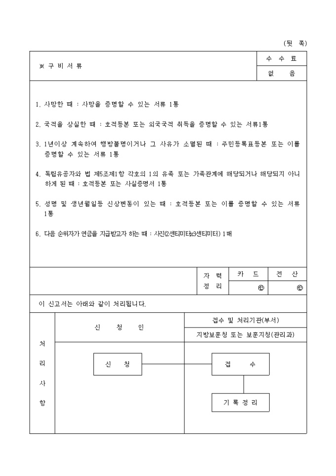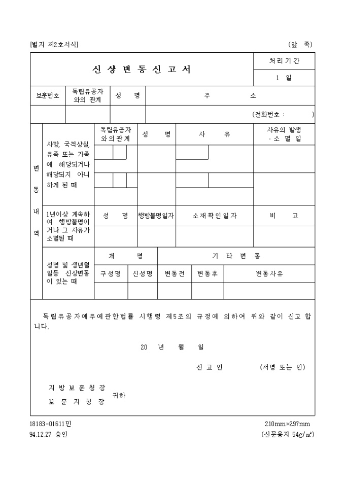 9,000원/월보훈번호, 독립유공자와의 관계, 변동내역 등의 항목으로 구성되어 있는 독립유공자신상변동 신고서 양식입니다.