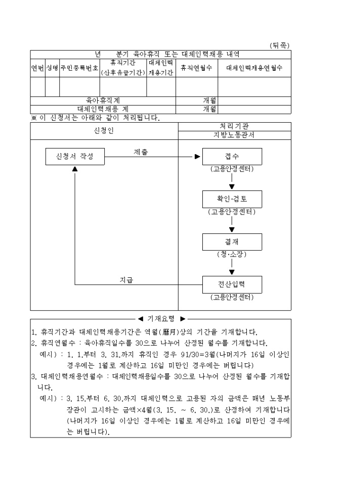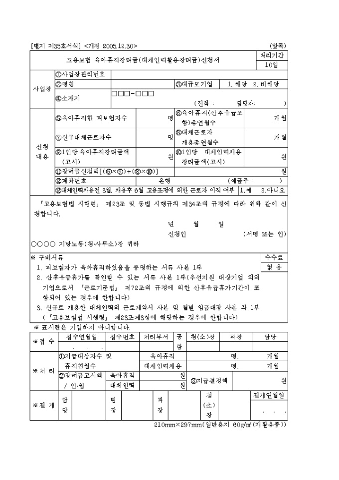 「고용보험법 시행령」 제23조 및 동법 시행규칙 제34조의 규정에 따라 고용보험 육아휴직장려금신청서입니다.