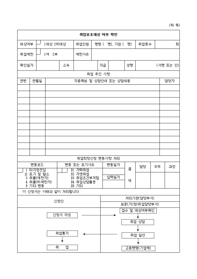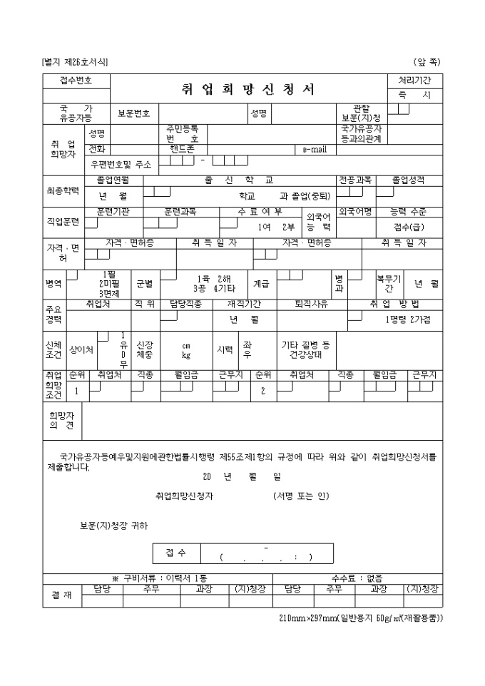 9,000원/월국가유공자등예우및지원에관한법률시행령 제55조제1항의 규정에 따라 취업희망신청을 하기위한 신청서 양식입니다.