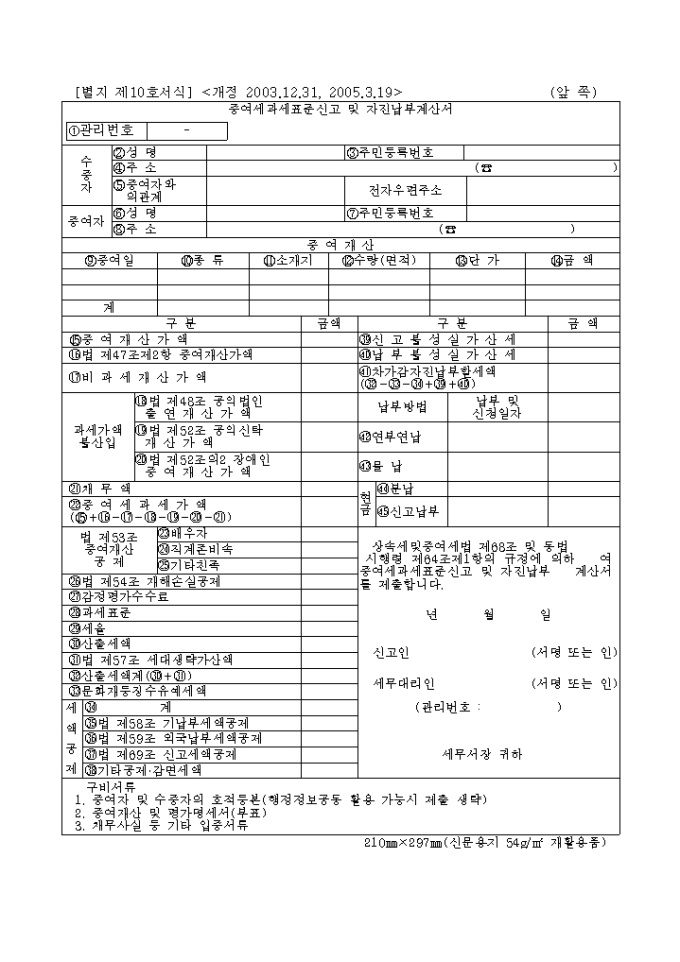 증여세과세표준신고 및 자진납부계산서](개정 2003.12.31, 2005.3.19)