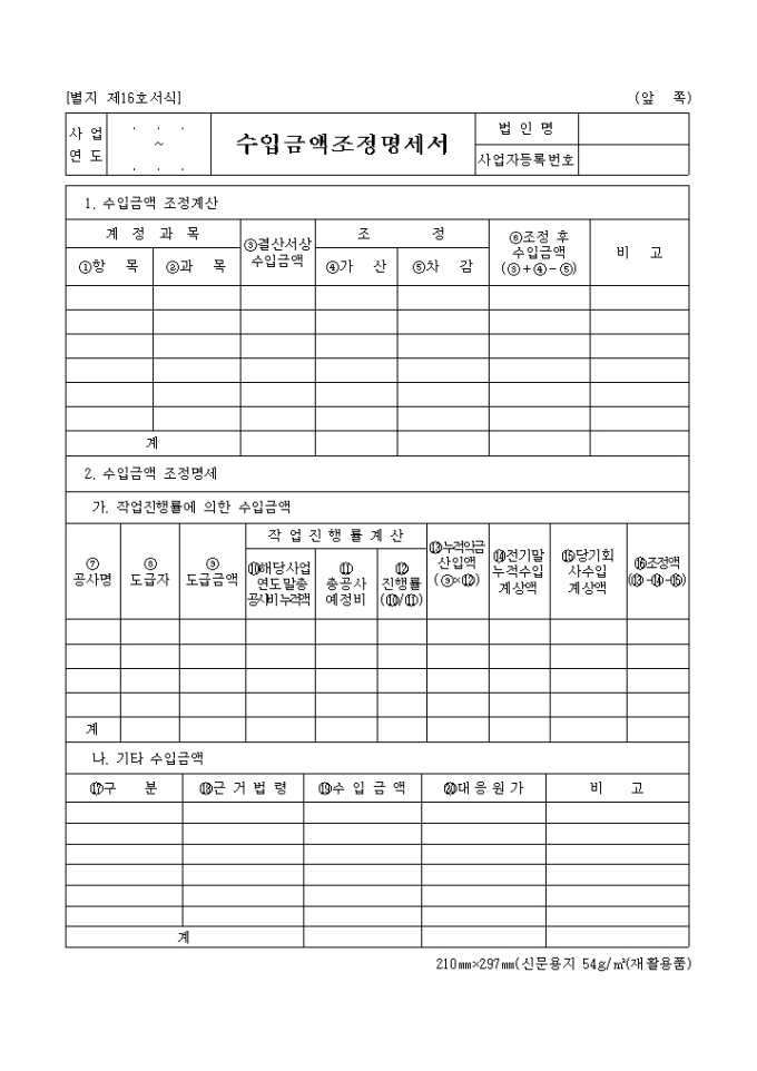 9,000원/월수입금액 조정명세서는 서식 1장과 작성요령 1장으로 구성되어 있습니다.