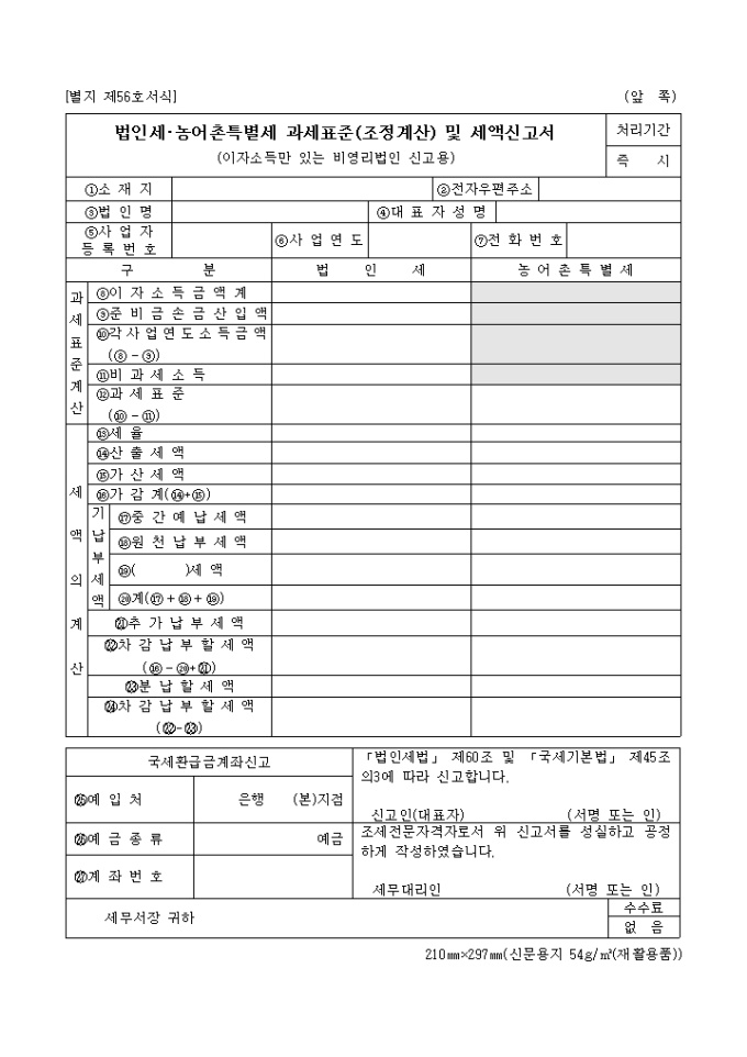 9,000원/월이자소득만 있는 비영리법인 신고용 법인세 및 농어촌 특별세 과세표준(조정계산) 및 세액 신고서는 서식 1장과 작성요령 1장으로 구성되어 있습니다.