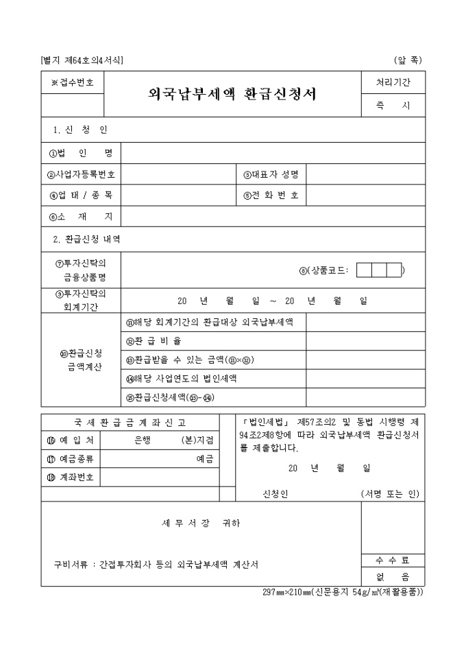 9,000원/월외국납부세액 환급신청서는 서식 1장과 작성요령 1장으로 구성되어 있습니다.