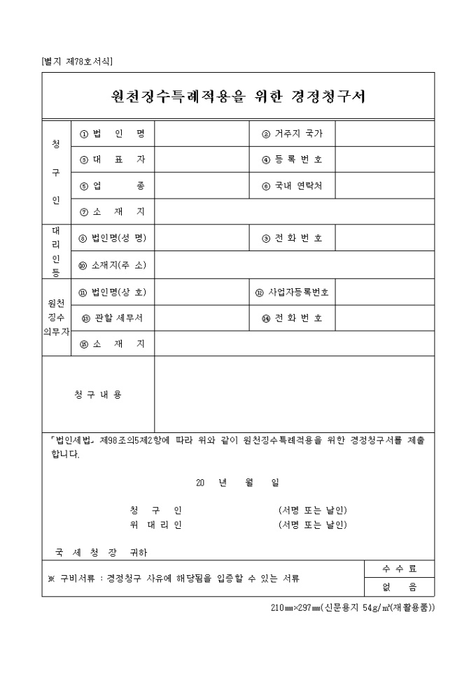 원천징수특례적용을위한경정청구서(법인세_별지 제78호)(06.03.14.개정)