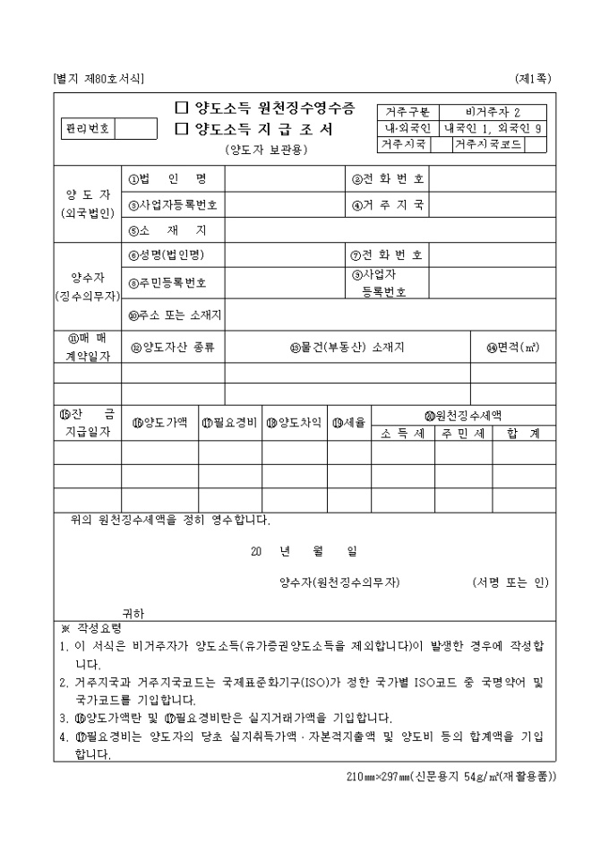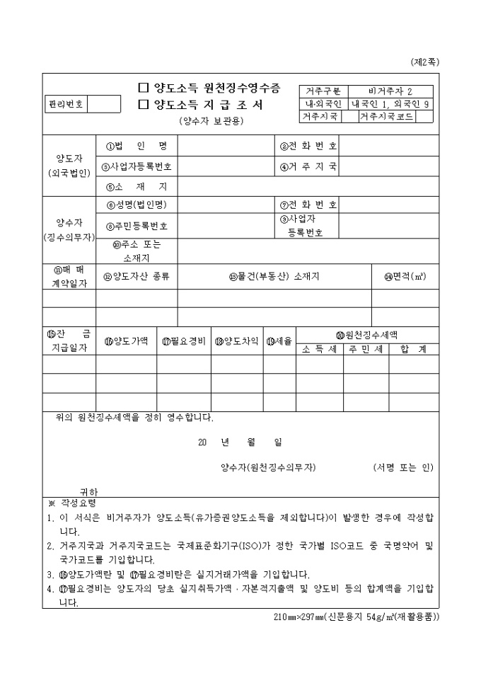 9,000원/월양도자 보관용 양도소득 원천징수영수증, 양도소득 지급조서 양식 입니다.