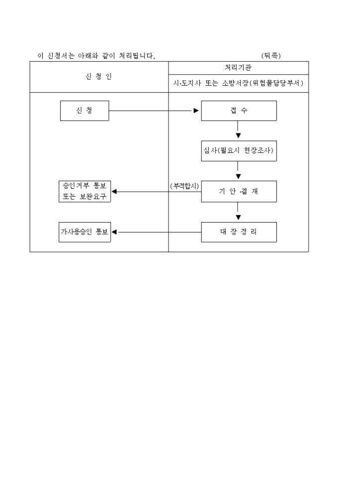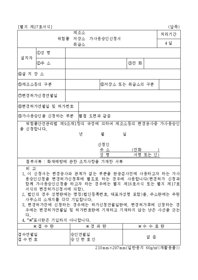 위험물안전관리법 제9조제1항의 규정에 의하여 제조소등의 변경공사중 가사용승인을 신청할때 사용합니다.