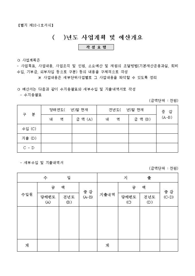 수지총괄표(수입, 지출, 당해연도말 현재, 전년도 말 현재 증감등)와 세부수입 및 지출내역서(수입원, 지출내역 증감등)로 작성하는 ○년도 사업계획 및 예산 개요 서식입니다.