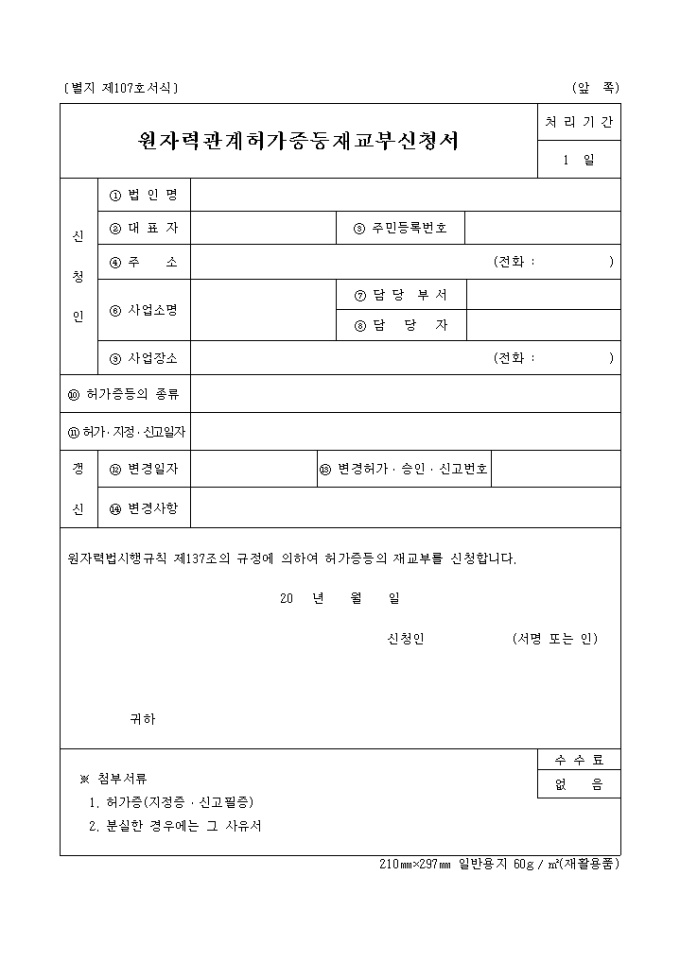 9,000원/월법인명, 대표자, 주소, 사업소명, 사업장소 등을 기재하며, 원자력법시행규칙 제137조의 규정에 의하여 허가증등의 재교부 신청시 사용하는 양식입니다.