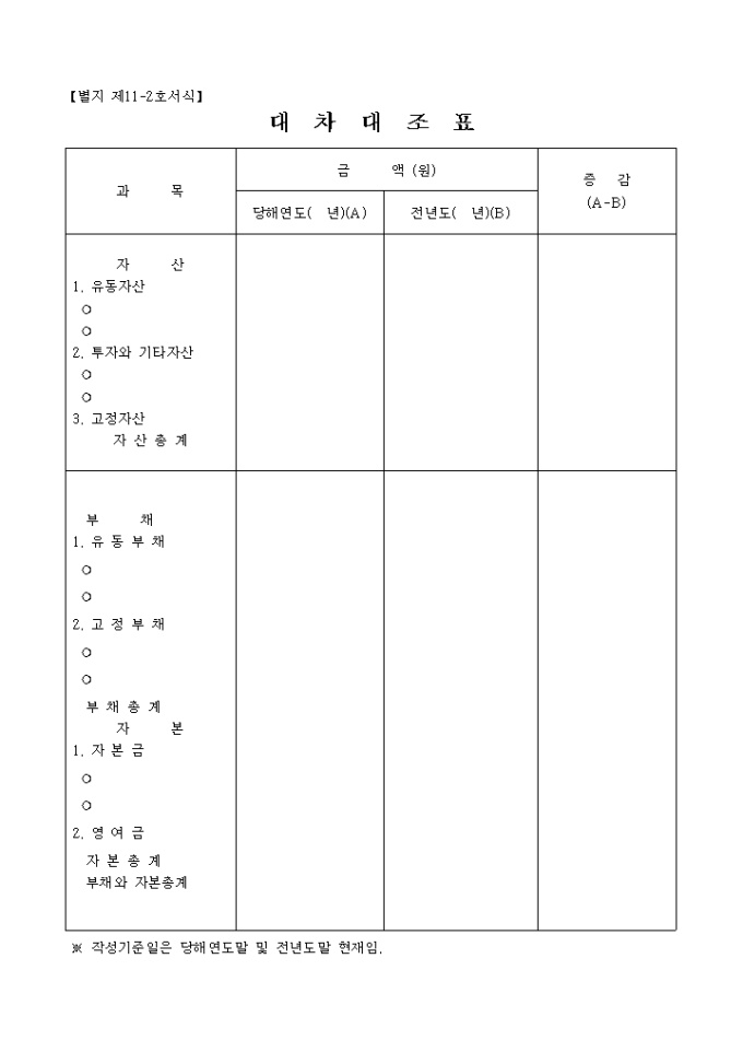 각 과목(자산,부채)에 대한 금액(당해년도, 전년도), 증감 을 기재하는 대차대조표 서식입니다.