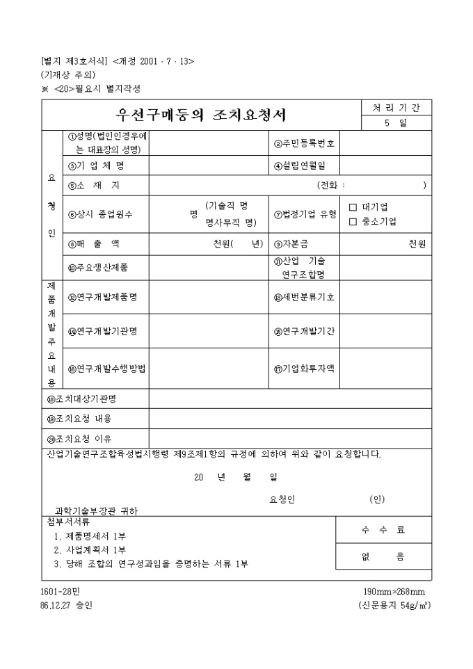 9,000원/월요청인, 제품개발주요내용 등을 기재하며,산업기술연구조합육성법시행령 제9조제1항의 규정에 의하여 요청시 사용하는 양식입니다.
