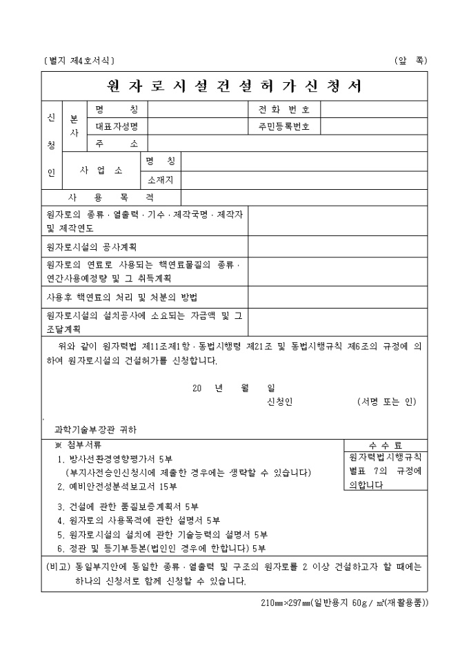 9,000원/월신청인, 사용목적 등을 기재하며, 원자력법 제11조제1항·동법시행령 제21조 및 동법시행규칙 제6조의 규정에 의하여 원자로시설의 건설허가를 신청시 사용하는 양식입니다.