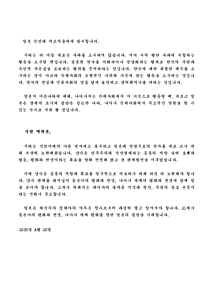 우리는 더 이상 새로운 사과를 요구하지 않습니다. 이미 누차 행한 사과에 부합하는 행동을 요구할 뿐입니다. 잘못된 역사를 미화하거나 정당화하는 행위로 한국의 주권과 국민적 자존심을 모욕하는 행위를 중지하라는 것입니다. 한국에 대한 특별한 대우를 요구하는 것이 아니라 국제사회의 보편적인 가치와 기준에 맞는 행동을 요구하는 것입니다. 역사의 진실과 인류사회의 양심 앞에 솔직하고 겸허해지기를 바라는 것입니다.