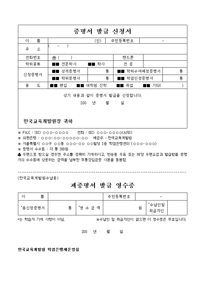 성적증명서, 학위증명서, 학위수여예정증명서, 학점인정증명서 등을 발급할 수 있는 신청서 양식 입니다.