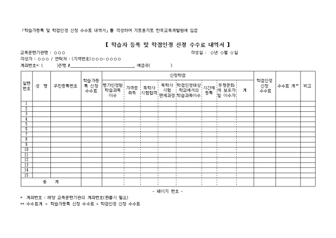 학습자 등록 및 학점인정 신청 수수료 내역서는 설명, 주민번호, 학습자 등록신청 수수료, 신청학점, 학점인정 신청 수수료 등을 작성하도록 구성되어 있습니다.