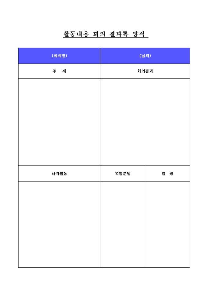9,000원/월활동내용 회의 결과록 양식은 주제, 회의결과, 하위활동, 역할분담, 일정 등을 작성하도록 구성되어 있습니다.