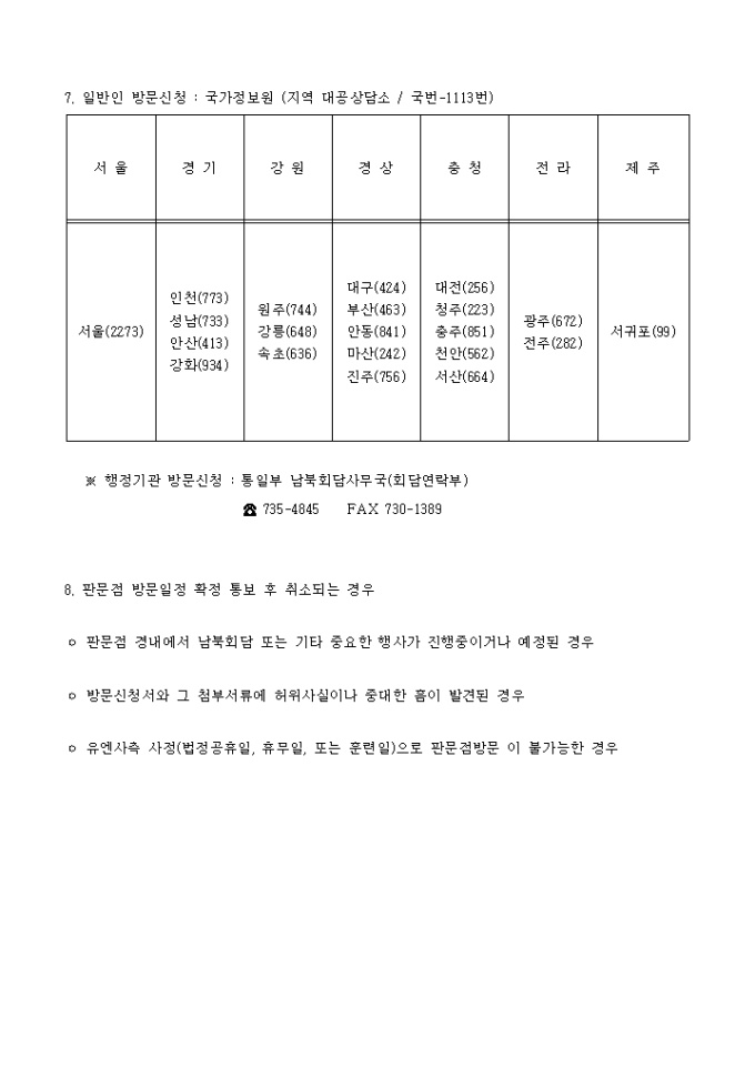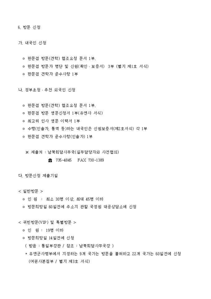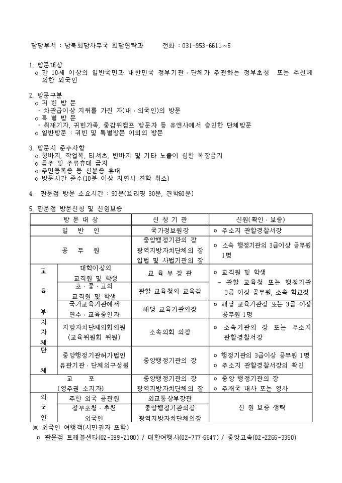 9,000원/월방문대상, 방문구분, 방문시 준수사항, 판문점 방문소요시간 등 이 설명 되어있는 판문점방문 절차 및 서식 안내입니다.