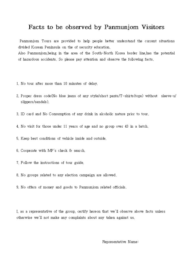 9,000원/월9가지 유의사항이 영문으로 구성되어있는 판문점견학자 준수사항 입니다.