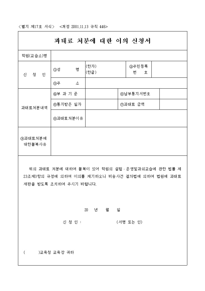 9,000원/월학원의 당사자로한 과태료 처분에 대하여 이의를 신청 할 때 사용하는 양식 입니다.