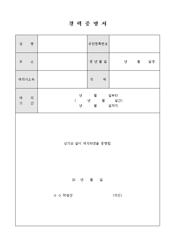 9,000원/월학원 강사 및 직원들을 경력을 증명하기 위해 사용할 수 있는 경력증명서 양식 입니다.