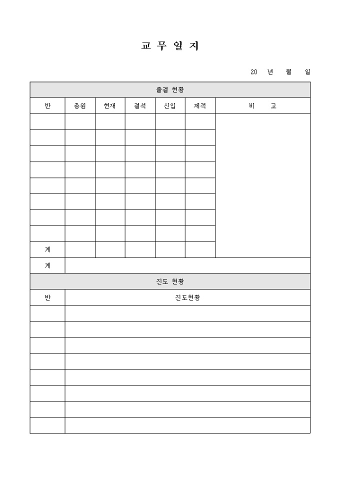 9,000원/월학원 수강생들을 출결현황, 진도현황 등을 확인할 수 있도록 구성되어 있는 교무일지 양식입니다.