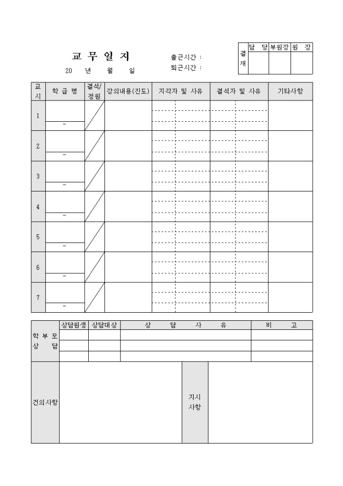 학원 수강생들을 강의, 출결, 상담, 건의사항, 지시사항 등을 관리 할 수 있는 교무일지 양식입니다.