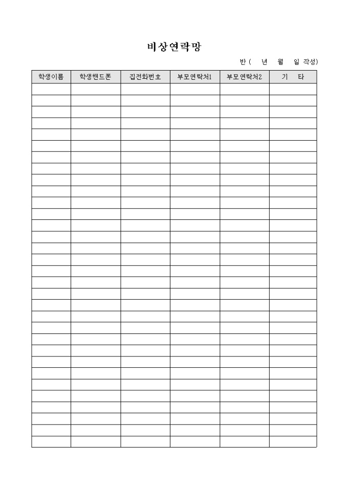 학생이름, 학생핸드폰, 부모님연락처 등으로 구성되어 있는 비상연락망 양식입니다.