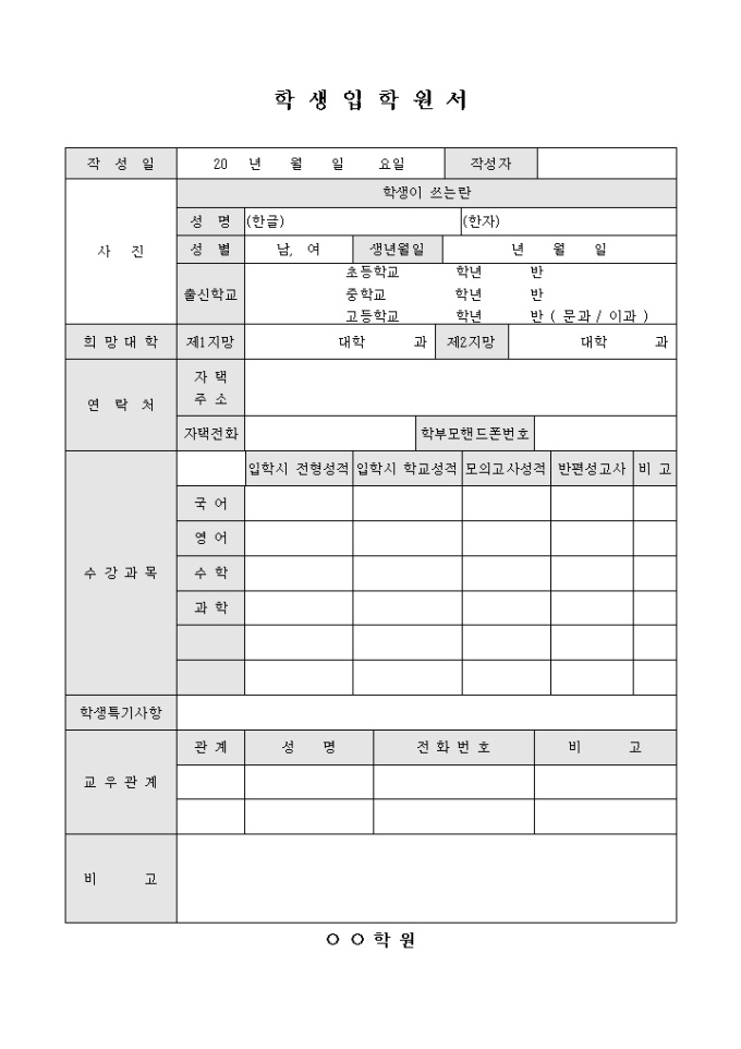학원 입학원서(고등부)