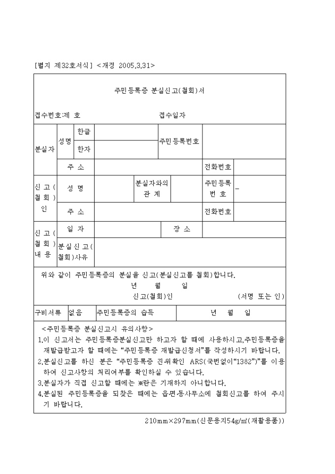 주민등록법에 의한 2005.3.31 개정된 주민등록증 분실시 신고하는 양식입니다.