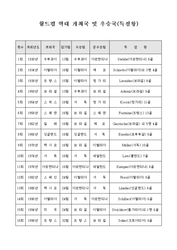 2006년 독일 월드컵을 맞아 역대 월대컵 개최국 및 우승국과 더불어 영광을 득점왕을 알아 보겠습니다.