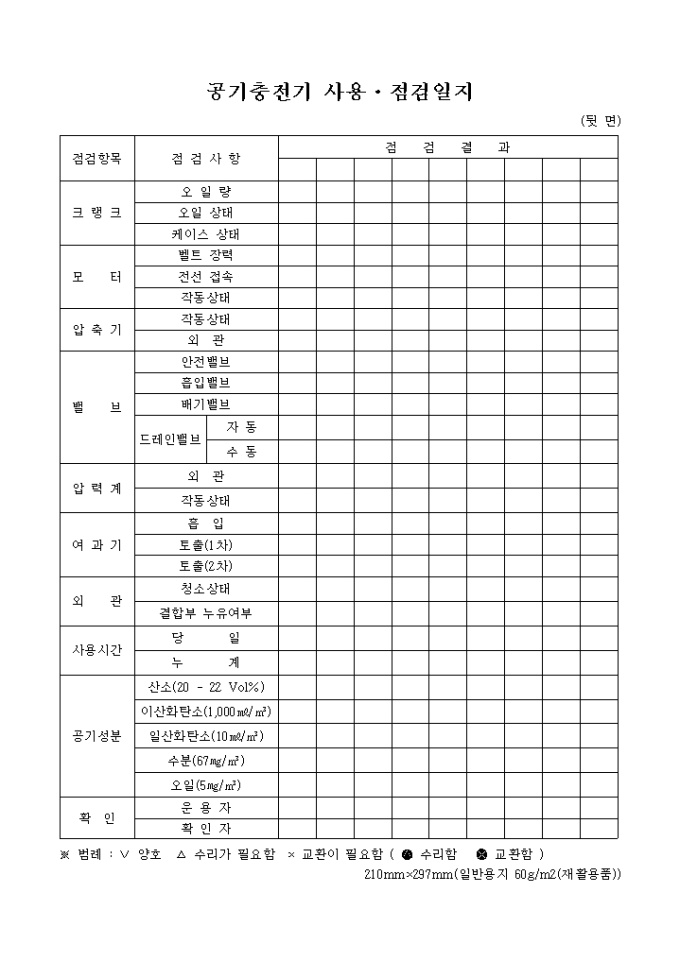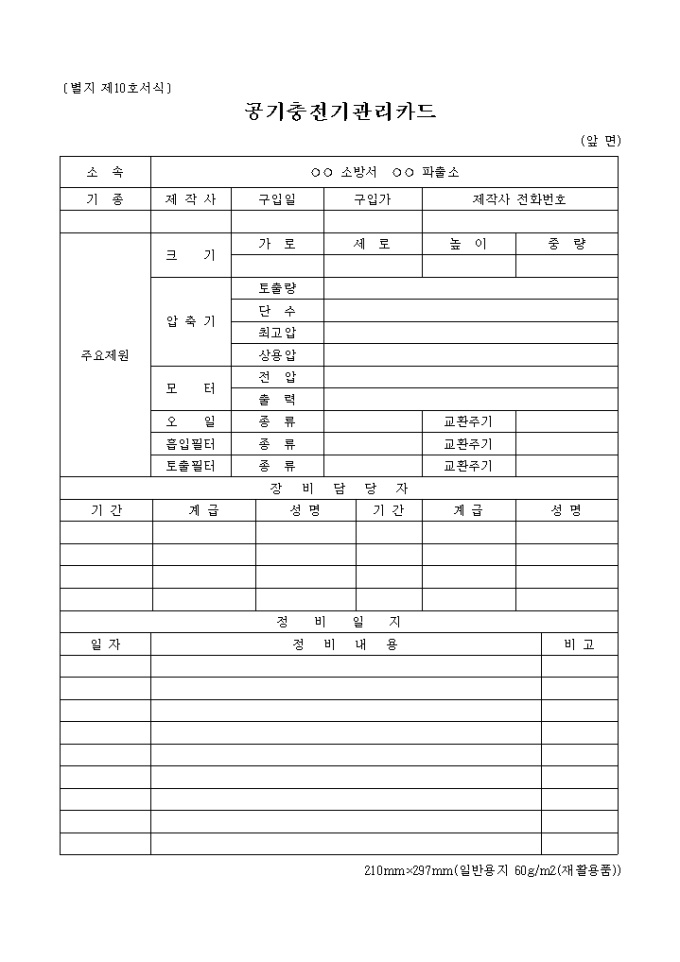 9,000원/월공기충전기관리카드 양식은 소속, 기종, 제작사, 구입일, 구입가, 주요제원 등을 항목으로 되어 있습니다.