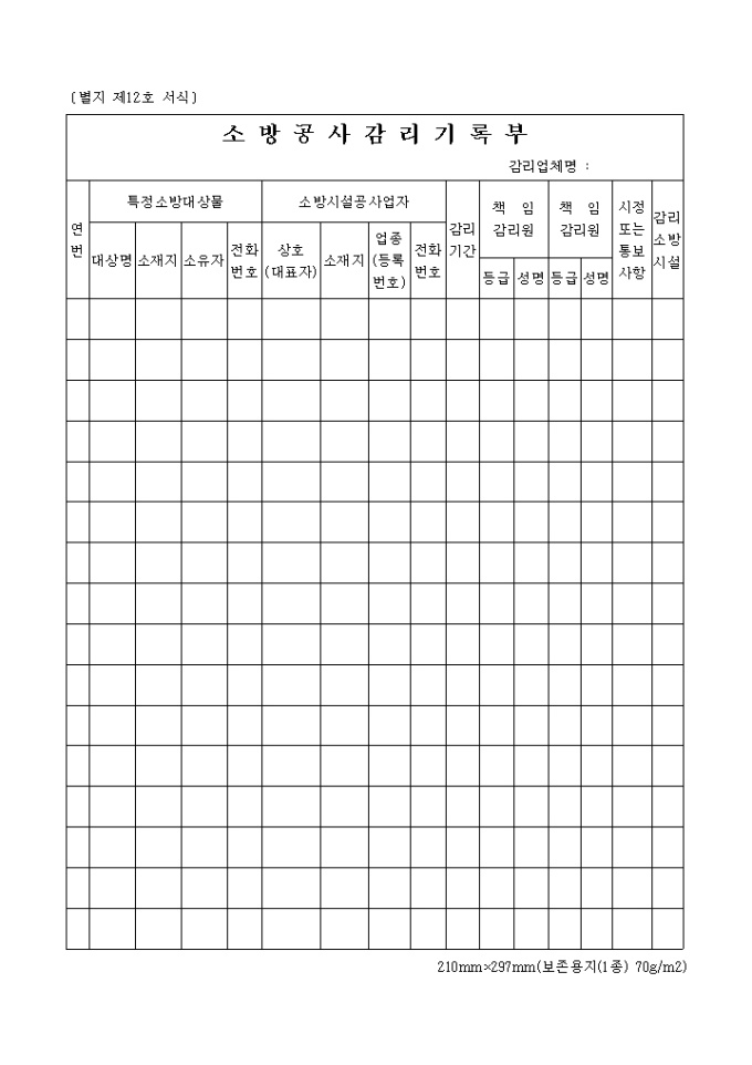 9,000원/월소방감사 감리 기록부는 연번, 특정소방대상물, 소방시설공사업자, 감리기간 등의 항목으로 구성되어 있습니다.