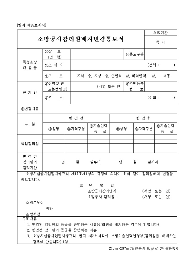 소방공사감리원배치변경통보서(별지 제25호서식)