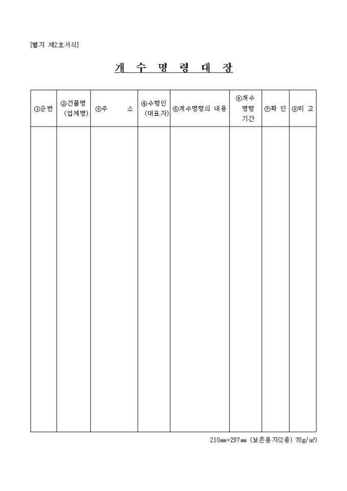 개수명령대장 양식은 순번, 건물명, 주소, 수령인, 개수명령의 내용 등의 항목으로 구성되어 있습니다.