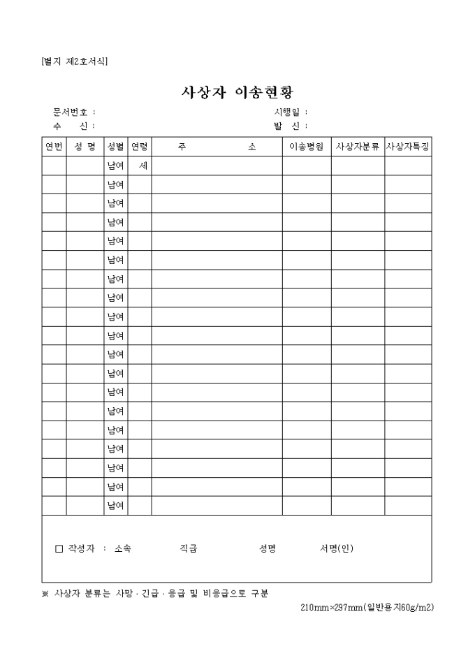 9,000원/월사상자 이송현황 양식은 연번, 성명, 성별, 연령, 주소, 이송병원 등의 항목으로 구성되어 있습니다.