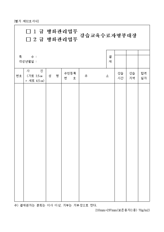 1, 2급 방화관리업무강습교육수료자명부대장(별지 제32호서식)