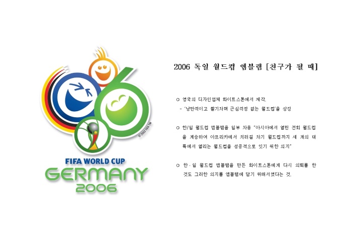 2006년 독일월드컵 엠블렘 입니다. 가로형식으로 되어 있으며, 엠블렘과 엠블렘의 의미를 보실 수 있습니다.