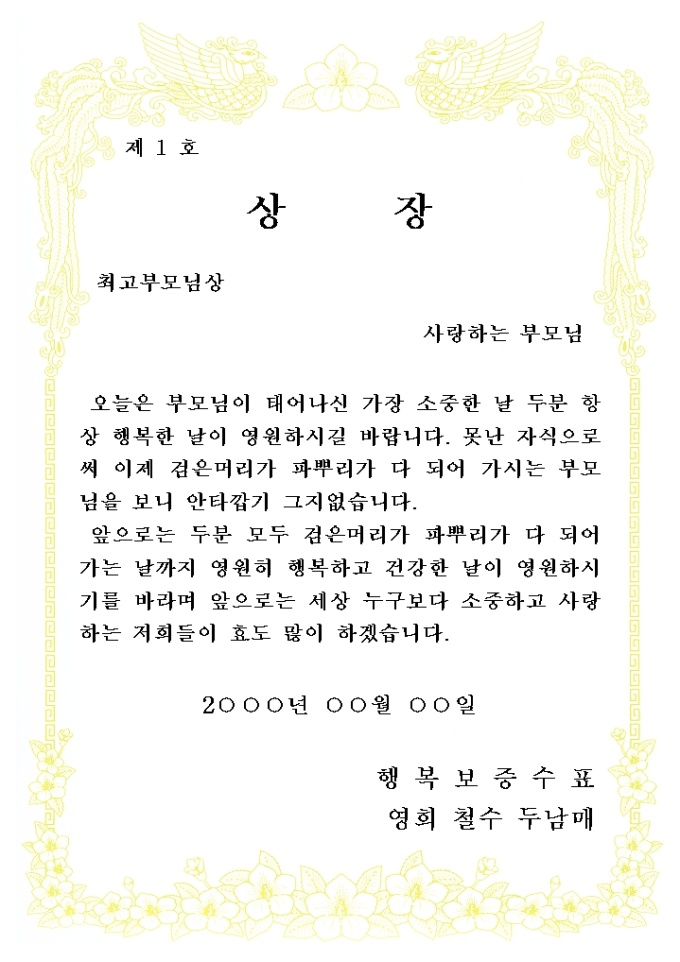 어버이날이나 부모님 생신에 쓰일수 있는 봉황무늬의 상장 서식입니다.
