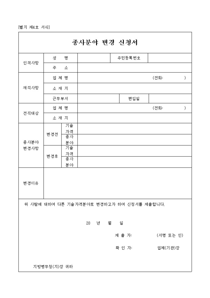 9,000원/월산업기능요원이 종사분야를 변경신청할때 쓰일수 있는 서식입니다.