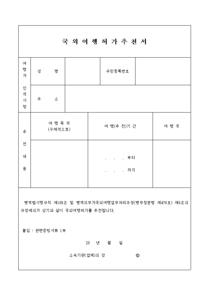 산업기능요원이 지정업체장의 국외 여행의 허가 추천서를 받을때 필요한 서식입니다.