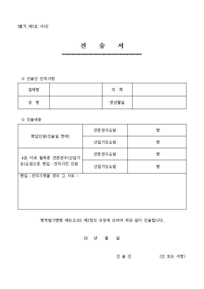 친인척을 병역 및 산업기능요원으로 전직시켰을 경우 사용되는 서식입니다.