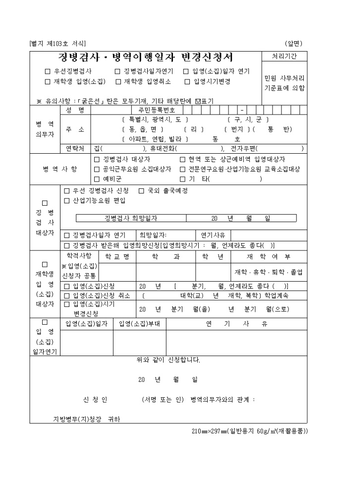 징병검사병역이행일자변경시 필요한 신청서이며 산업기능요원에게 필요한 서식입니다.