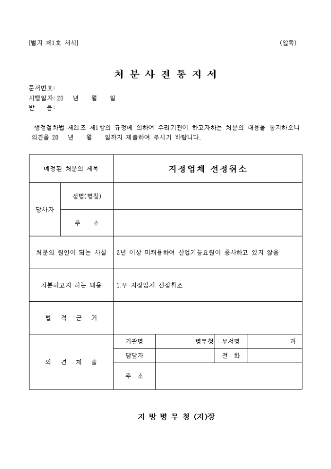 9,000원/월병역지정업체가 산업기능요원을 미채용하여 지정업체지정을 처분하는 서식입니다.