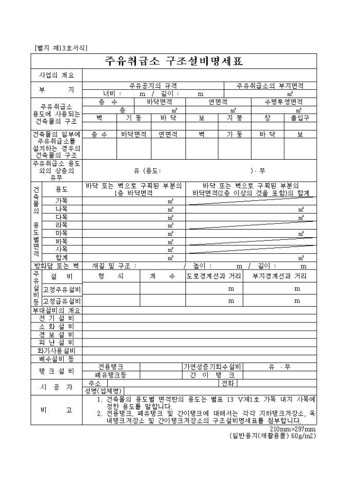 9,000원/월주유취급소 구조설비명세표양식은 사업의 개요, 부지, 주유취급소 용도에 사용되는 건축물의 구조등의 항목으로 구성되어 있습니다.