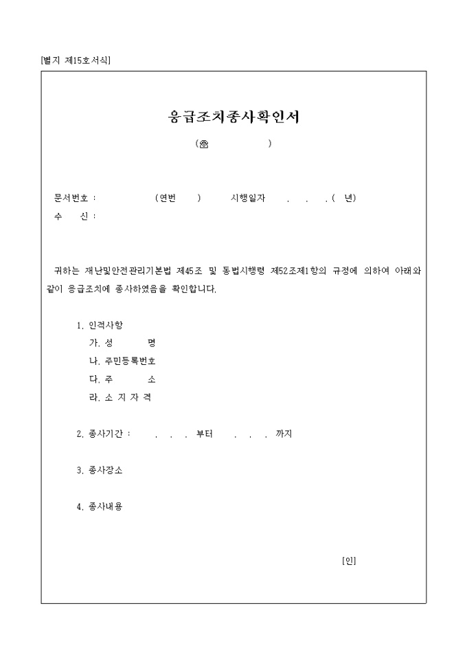 9,000원/월응급조치종사확인서 양식은 문서번호, 시행일자, 수신등의 항목으로 구성되어 있습니다.