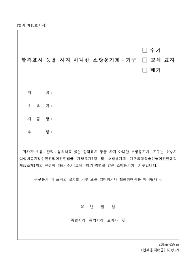 9,000원/월합격표시 등을 하지 아니한 소방용기계·기구 양식은 위치, 소유자, 제품명, 수량 등의 항목으로 구성되어 있습니다.