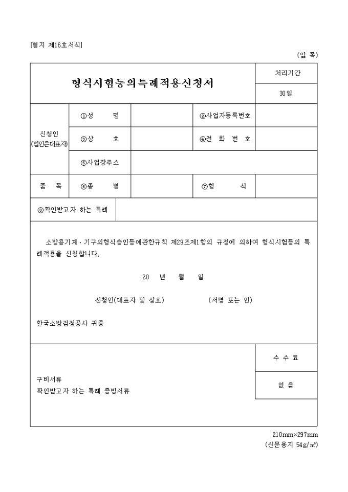9,000원/월형식시험등의특례적용신청서 양식은 신청인의 인적사항, 품목, 확인받고자 하는 특례등의 항목으로 구성되어 있다.