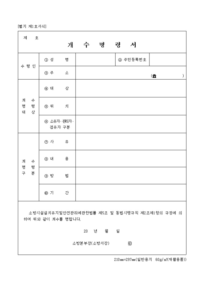 9,000원/월개수명령서 양식은 수령인의 인적사항과 개수명령대상, 개수명령 구분 등의 항목으로 구성되어 있다.