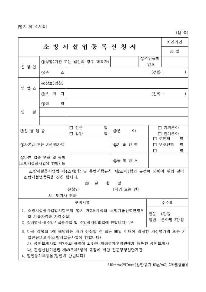 9,000원/월소방시설업등록신청서 양식은 신청인, 영업소, 임원, 신청업종, 자본금 또는 자산 평가액 등의 항목으로 구성되어 있습니다.